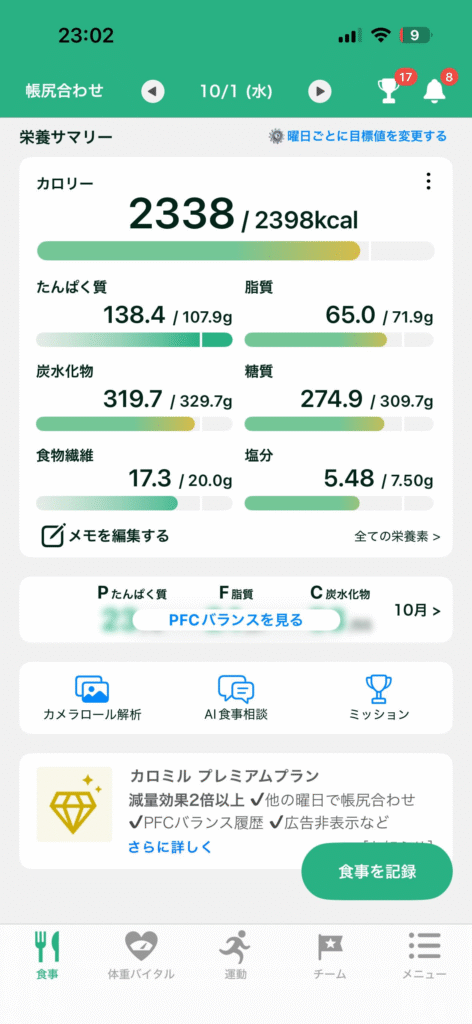 そこでカロミルで毎食のPFCを管理し、間食はお菓子ではなくバナナやササミ、低脂質のおにぎりに切り替えました。結果、筋肉をキープしつつ脂肪を落とすことができ、体脂肪率は**21%→17%**まで改善しました。